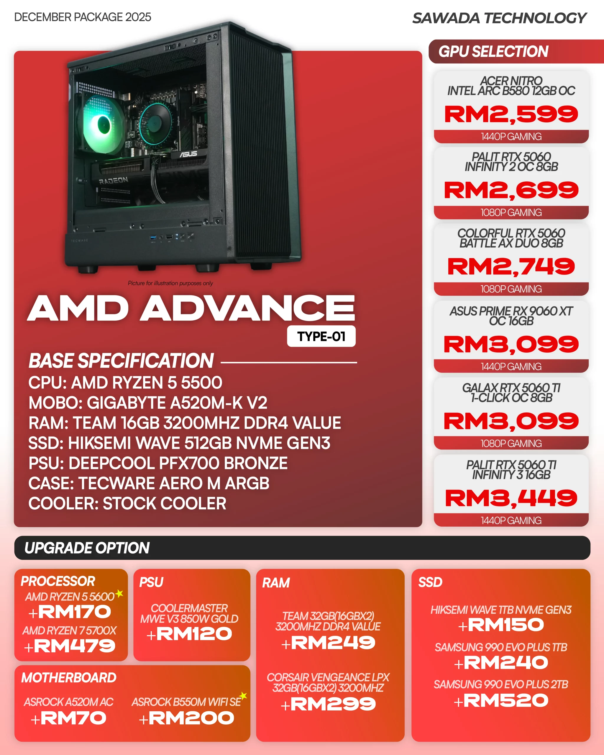 AMD Advance gaming PC Disember 2026, Ryzen 5 5500, 16GB RAM & SSD 512GB. GPU RTX 5060, 5060 Ti atau RX 9600 XT untuk 1080p gaming. PC custom Sawada Technology.