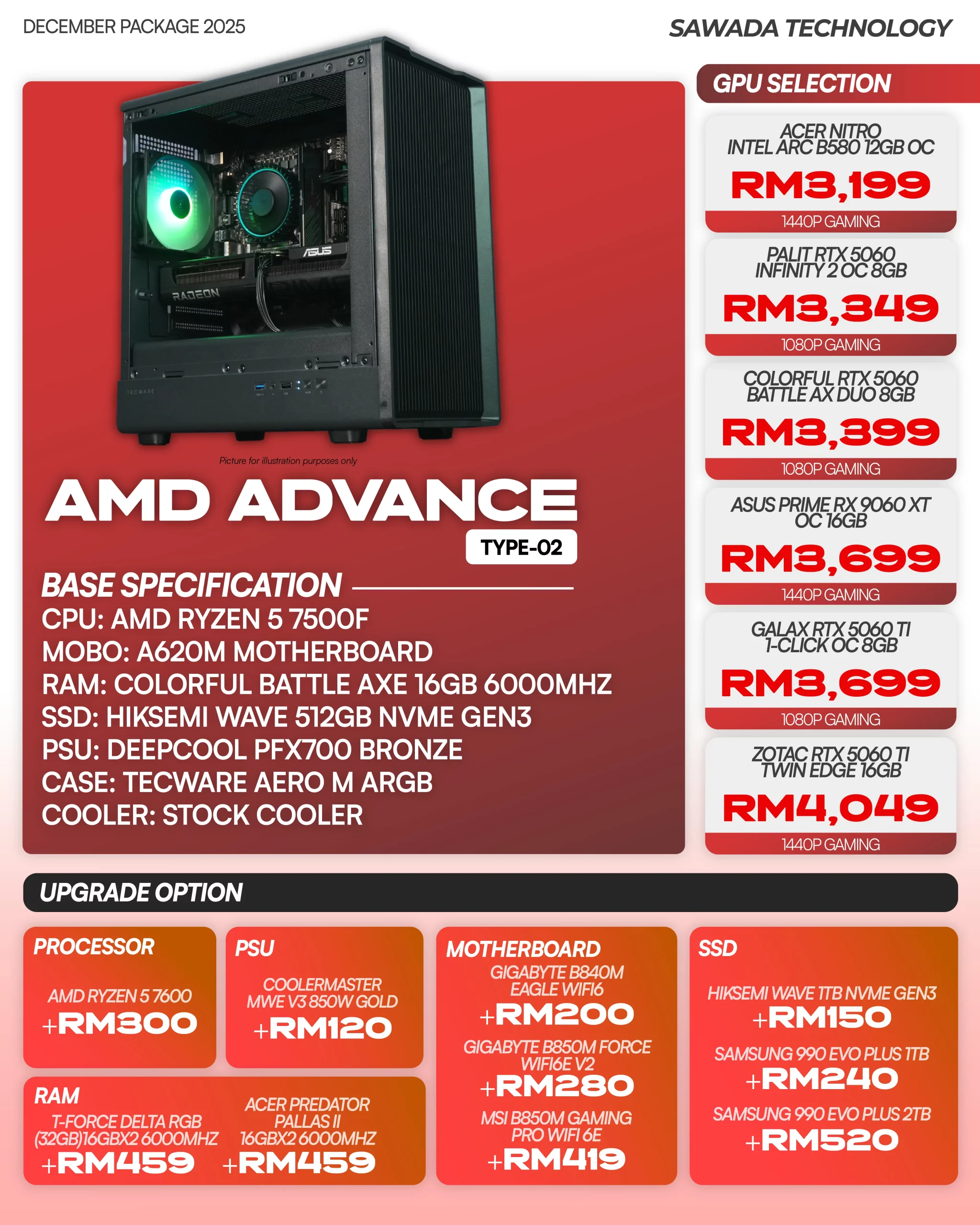 AMD Advance Type-02 Disember 2026, Ryzen 5 7500F, 16GB RAM & SSD NVMe 512GB. Gaming 1080p & 1440p untuk kerja office, study & popular games. Sawada Technology.