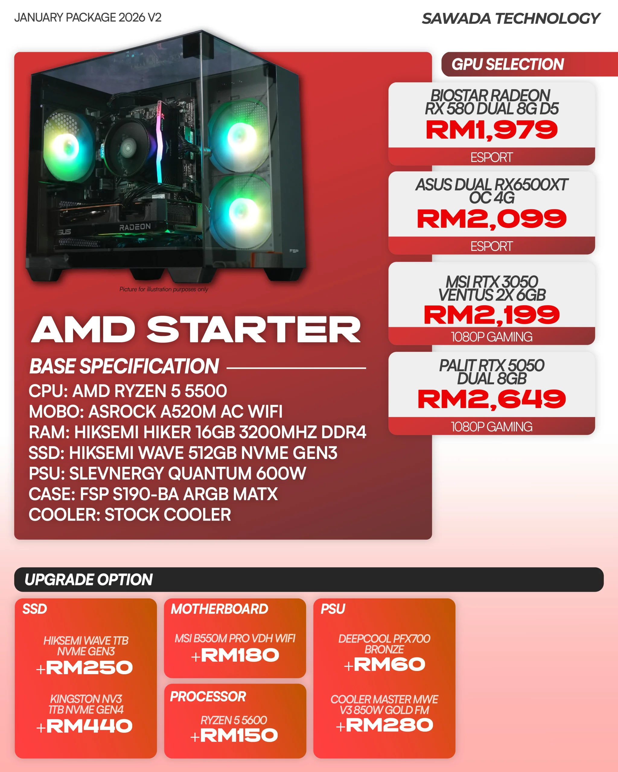 JAN 2026 entry-level gaming PC powered by AMD Ryzen 5 5500. Built for smooth esports and 1080p gaming with reliable components, fast NVMe storage, and a solid upgrade path. Ideal for first-time PC gamers, students, and budget-friendly gaming setups.
