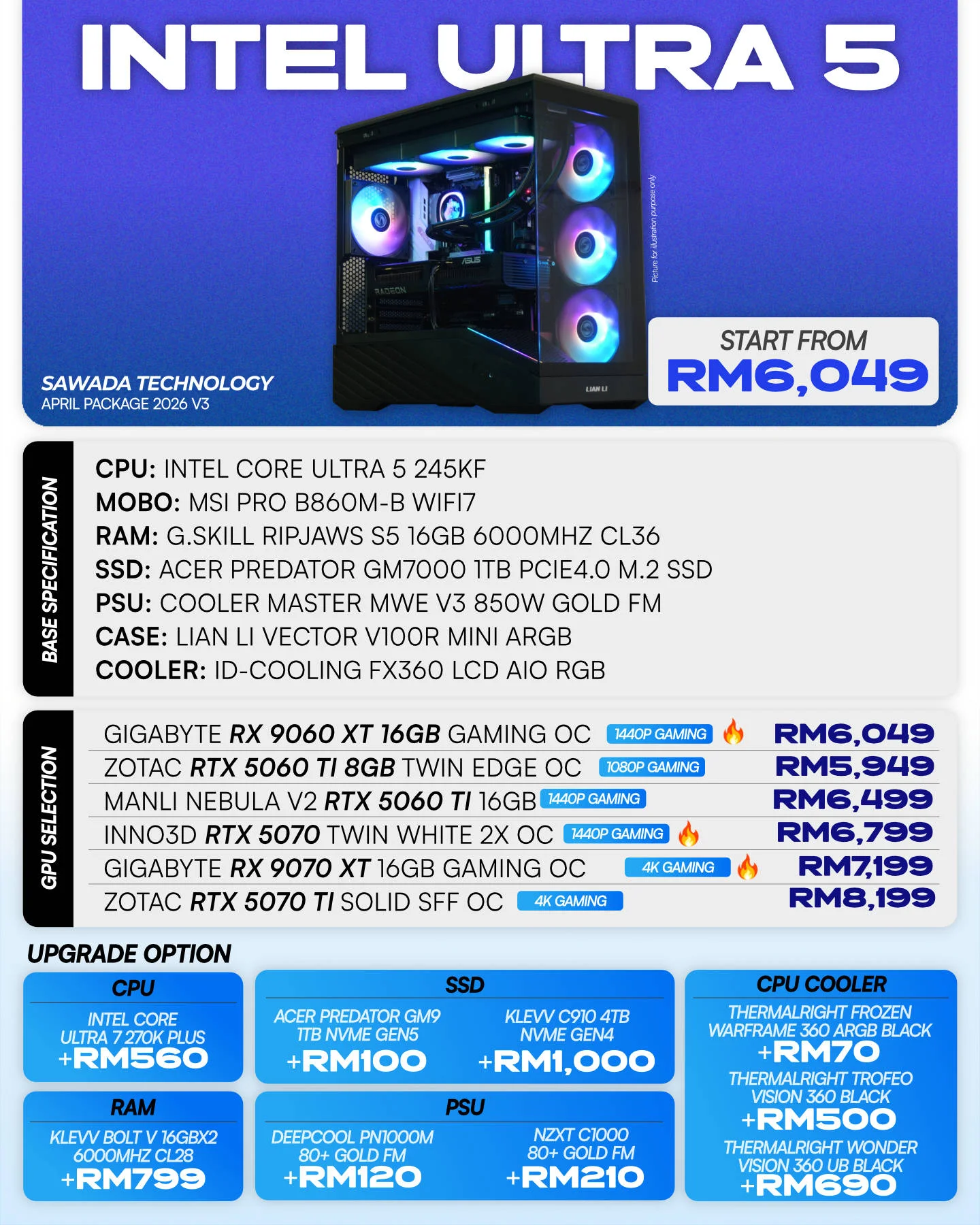 | GPU Upgrade | Zotac RTX 5060 Ti Twin Edge OC 8GB, Gigabyte RX 9060 XT 16GB Gaming OC, Manli Nebula V2 RTX 5060 Ti 16GB, Inno3D RTX 5070 Twin White 2x OC, Gigabyte RX 9070 XT 16GB Gaming OC, ZOTAC RTX 5070 Ti SOLID SFF OC |