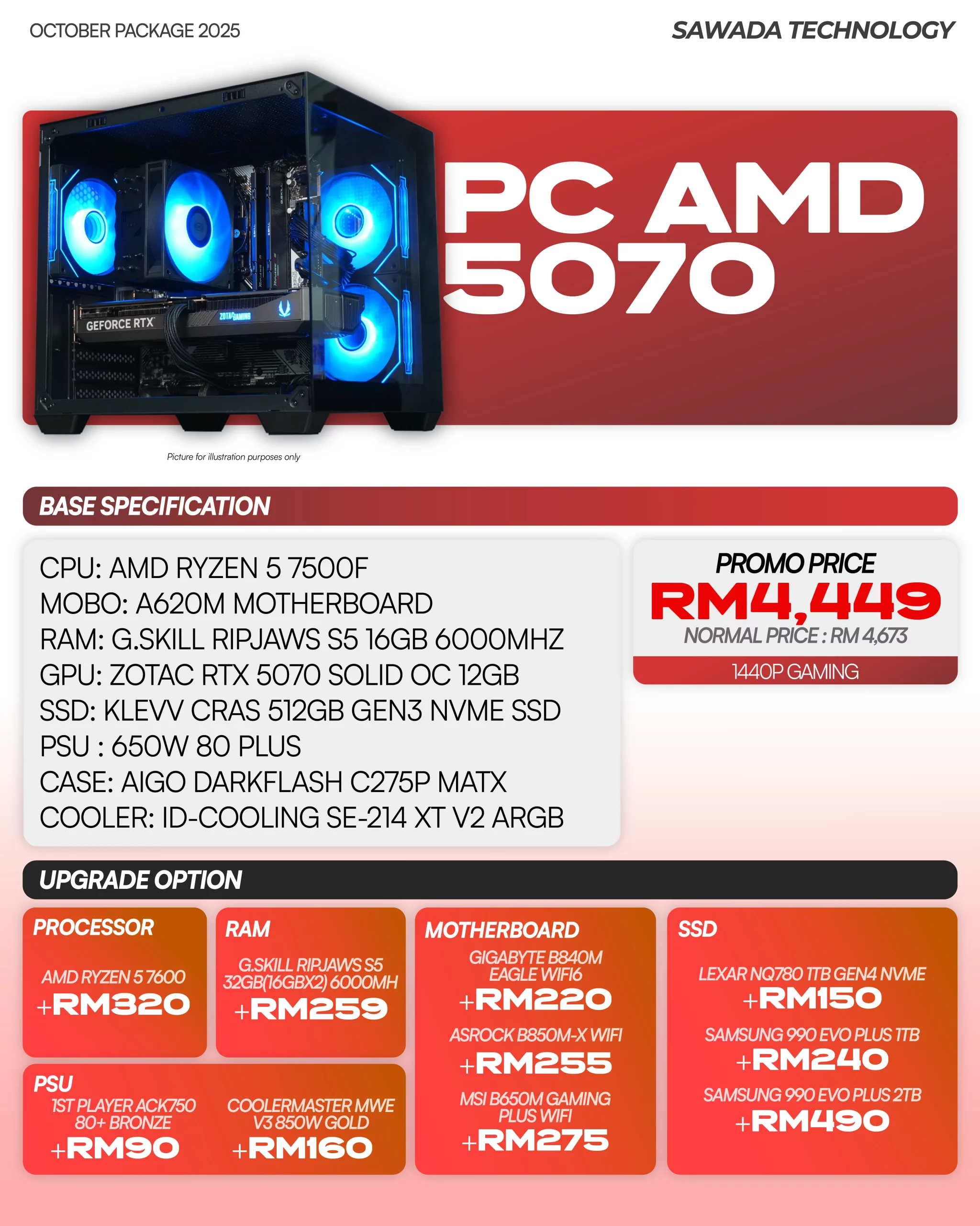 Get the PC AMD 5070 (October 2025) featuring AMD Ryzen 5 7500F, 16GB DDR5 RAM, and Zotac RTX 5070 12GB GPU for smooth 1440p gaming performance. Includes NVMe SSD storage, 650W PSU, and MATX case. Upgrade options available up to Ryzen 7 7600 and Samsung 990 EVO Plus SSD. A powerful mid-range gaming PC in Malaysia at promo price RM4,449.