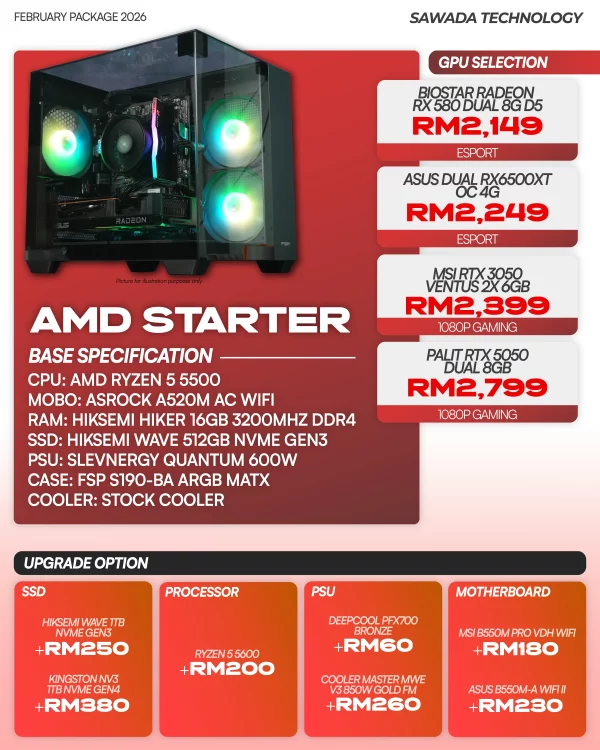 Entry-level AMD Ryzen 5 gaming PC for esports and 1080p gaming. Affordable and reliable build with NVMe SSD, ideal for beginners and casual gamers by Sawada Technology Malaysia.