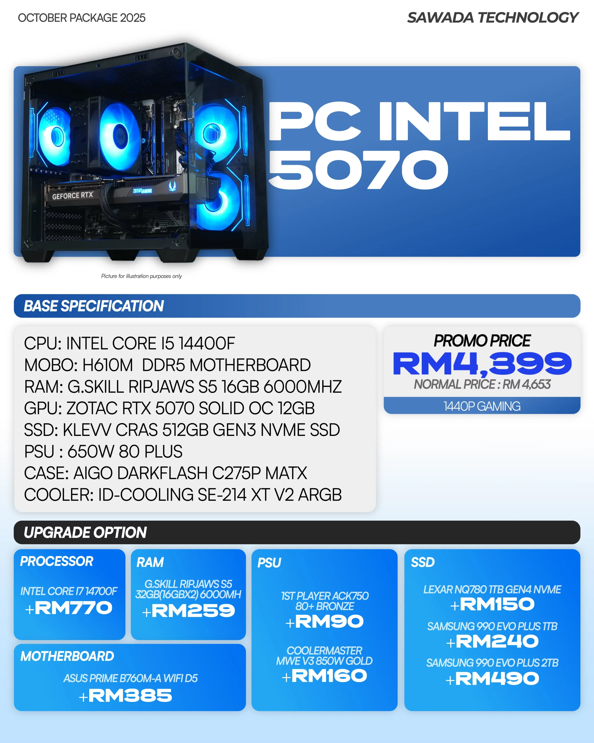Get the PC Intel 5070 (October 2025) featuring Intel Core i5 14400F, 16GB DDR5 RAM, and Zotac RTX 5070 12GB GPU for excellent 1440p gaming performance. Includes NVMe SSD storage, 650W PSU, and MATX case. Upgrade options available up to Intel Core i7 14700F, ASUS B760M-A WiFi D5 motherboard, and Samsung 990 EVO Plus SSD. Promo price RM4,399.