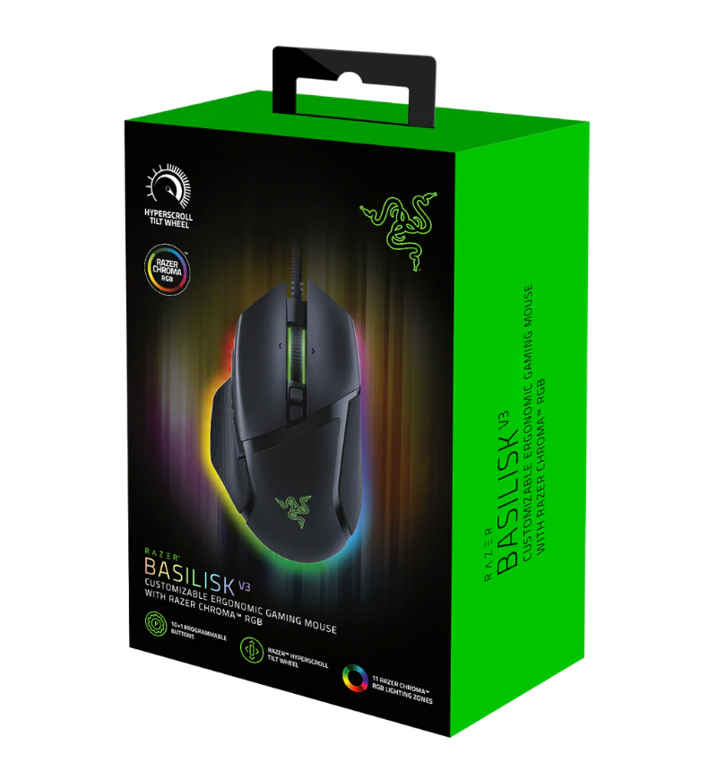 The Razer Basilisk V3 is a customizable ergonomic gaming mouse featuring the Focus+ 26K DPI optical sensor and Razer Chroma RGB lighting with 11 zones. Equipped with ultra-fast optical switches and HyperScroll tilt wheel technology.